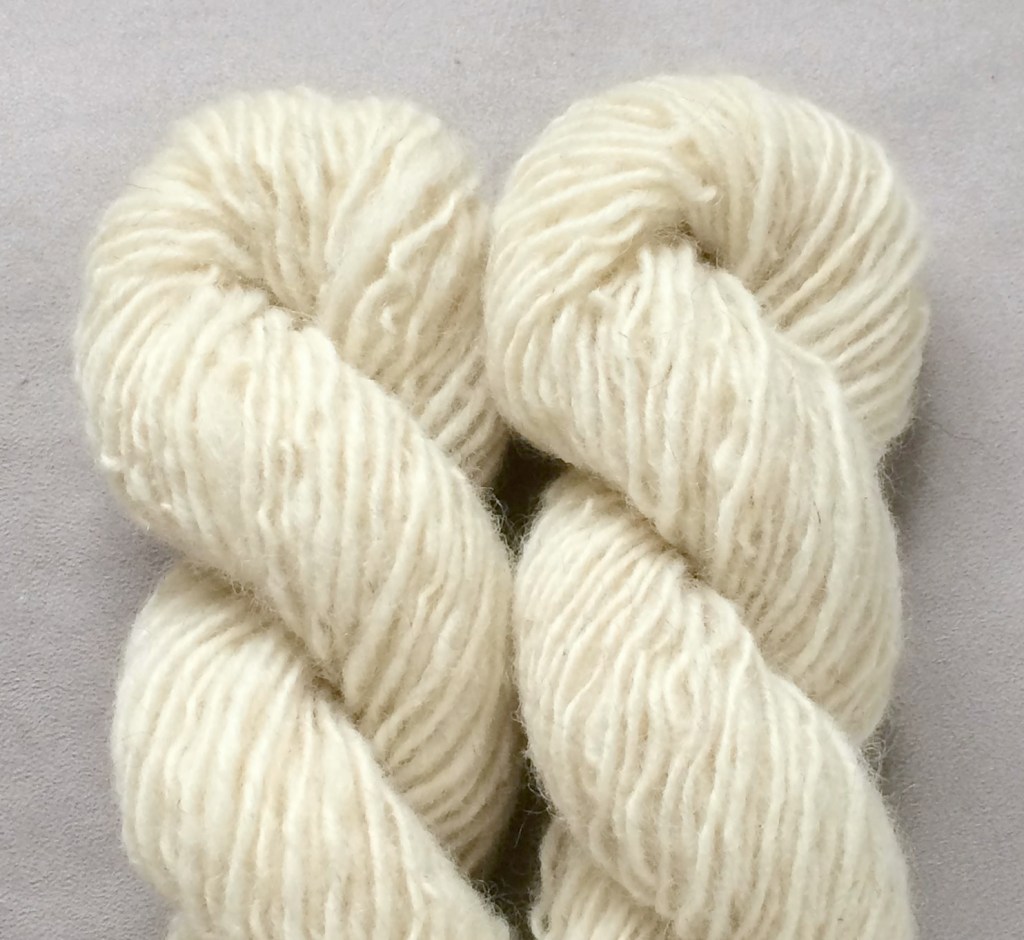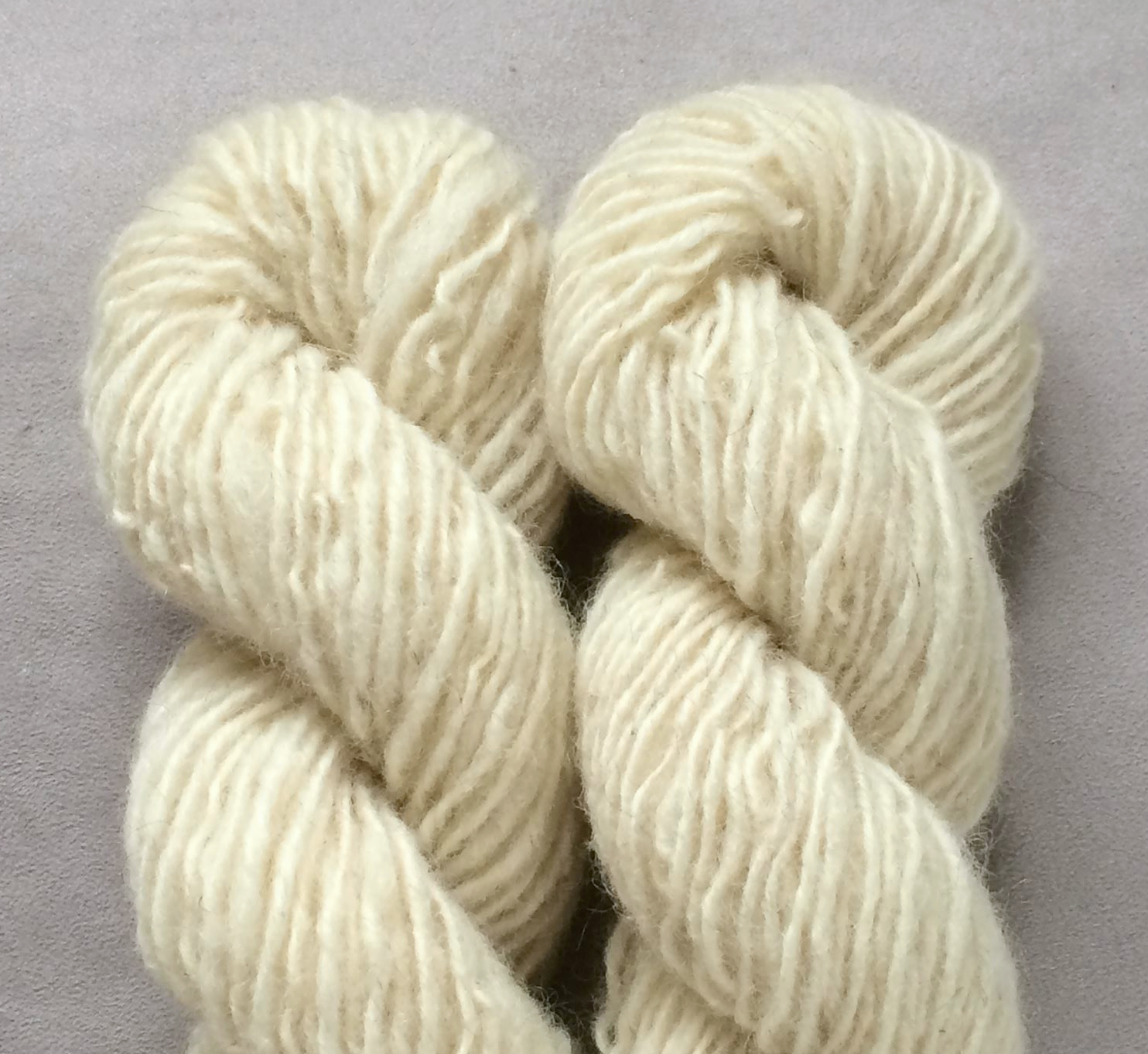 The underlying colour of this loosely spun, slightly fluffy yarn from the sheep wool of Leura in Karjaa, Finland, is natural white. Recommended needle size 4-5 mm.