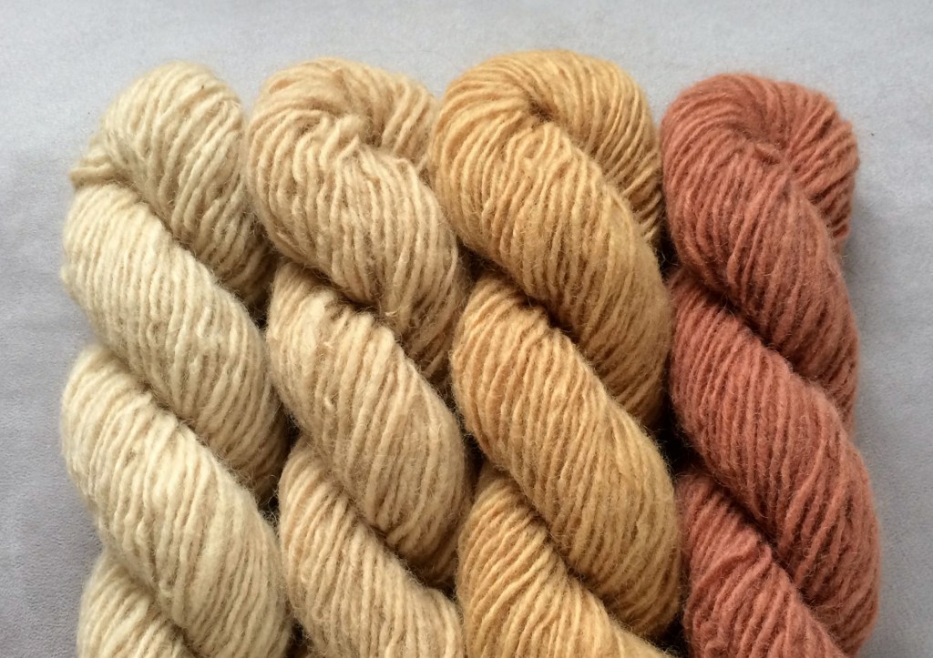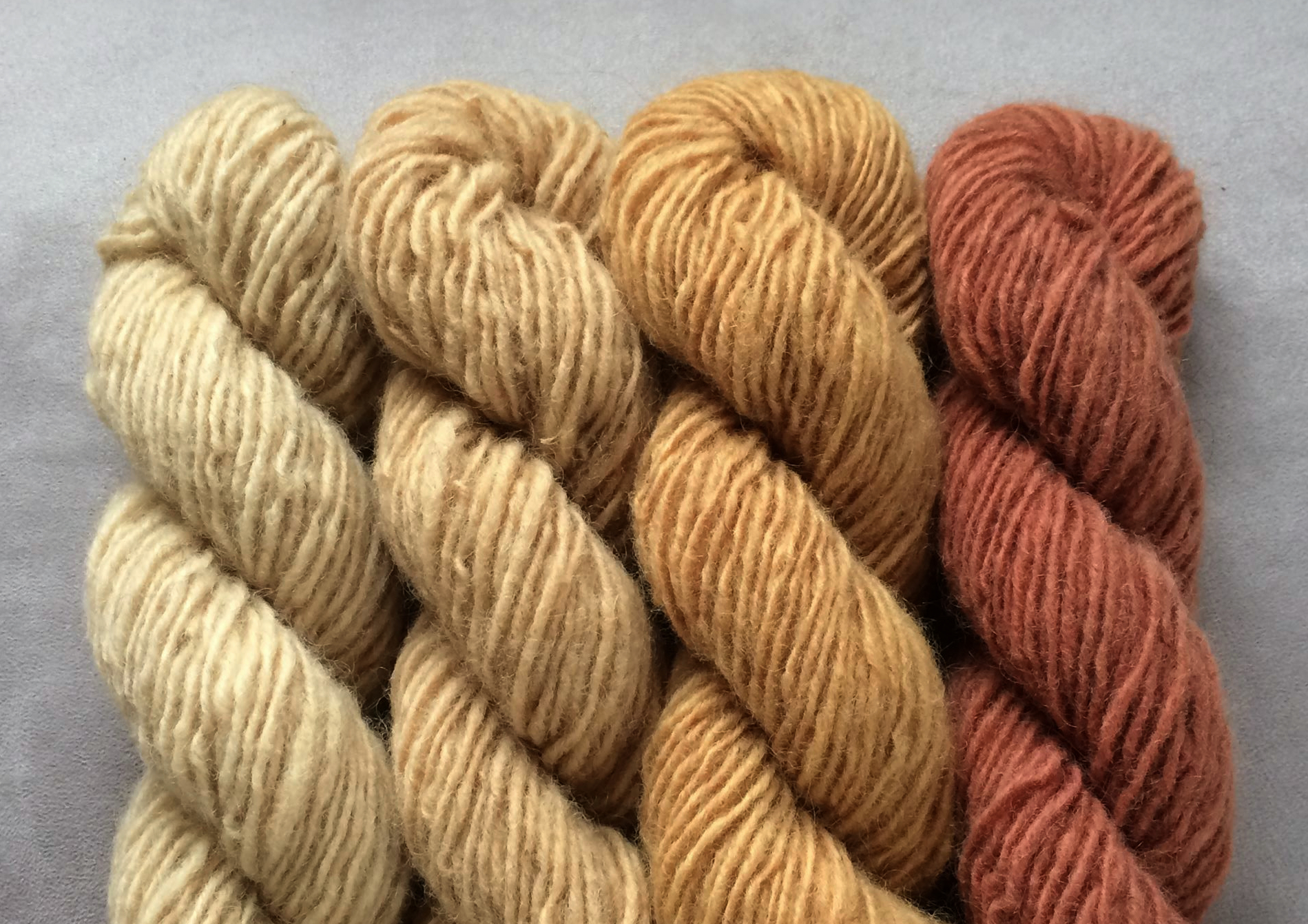 Dyes: (1) Yellow onion peel, horse chestnut, black alder cones, (2) ostrich fern, (3) yellow onion peel, (4) alder buckthorn bark