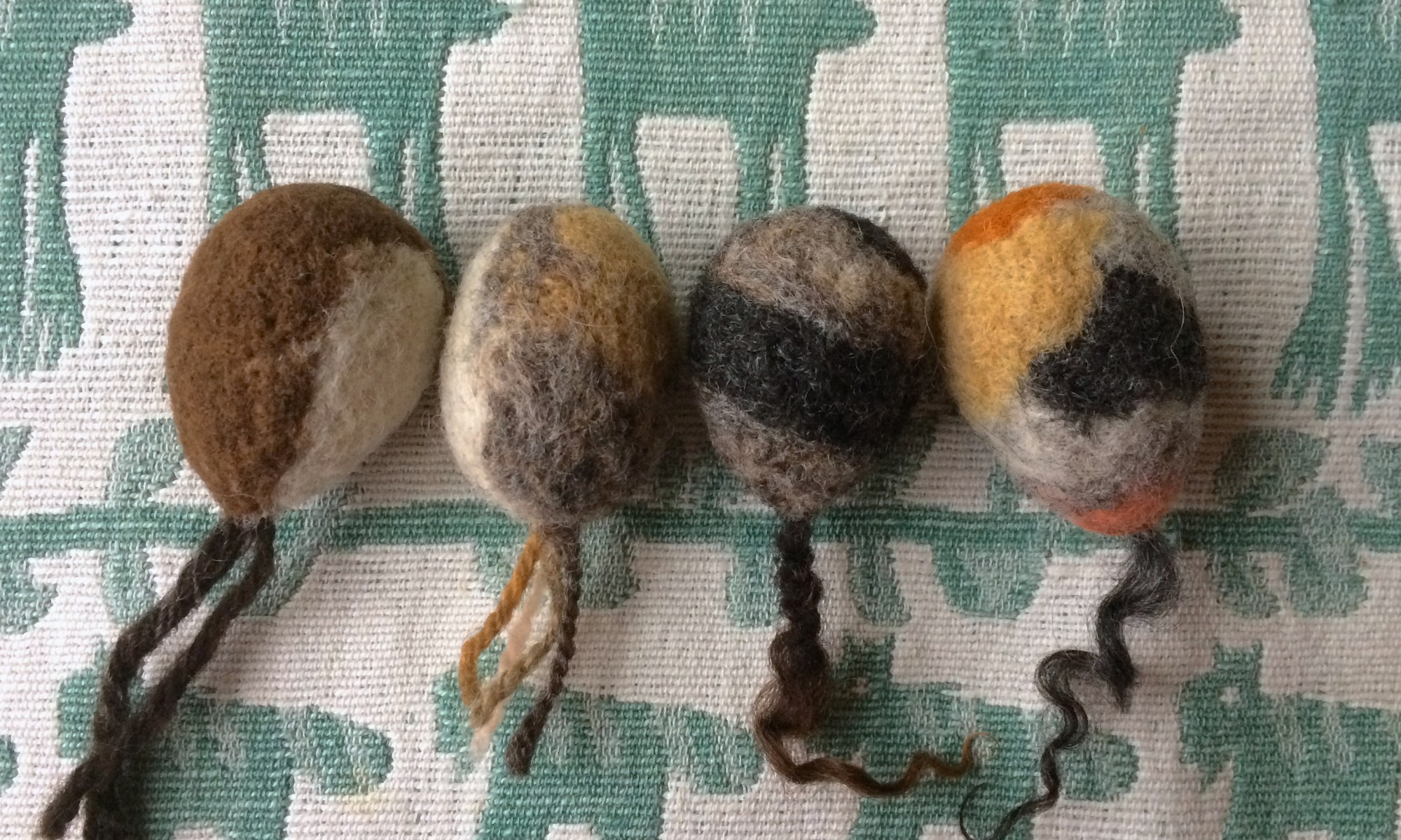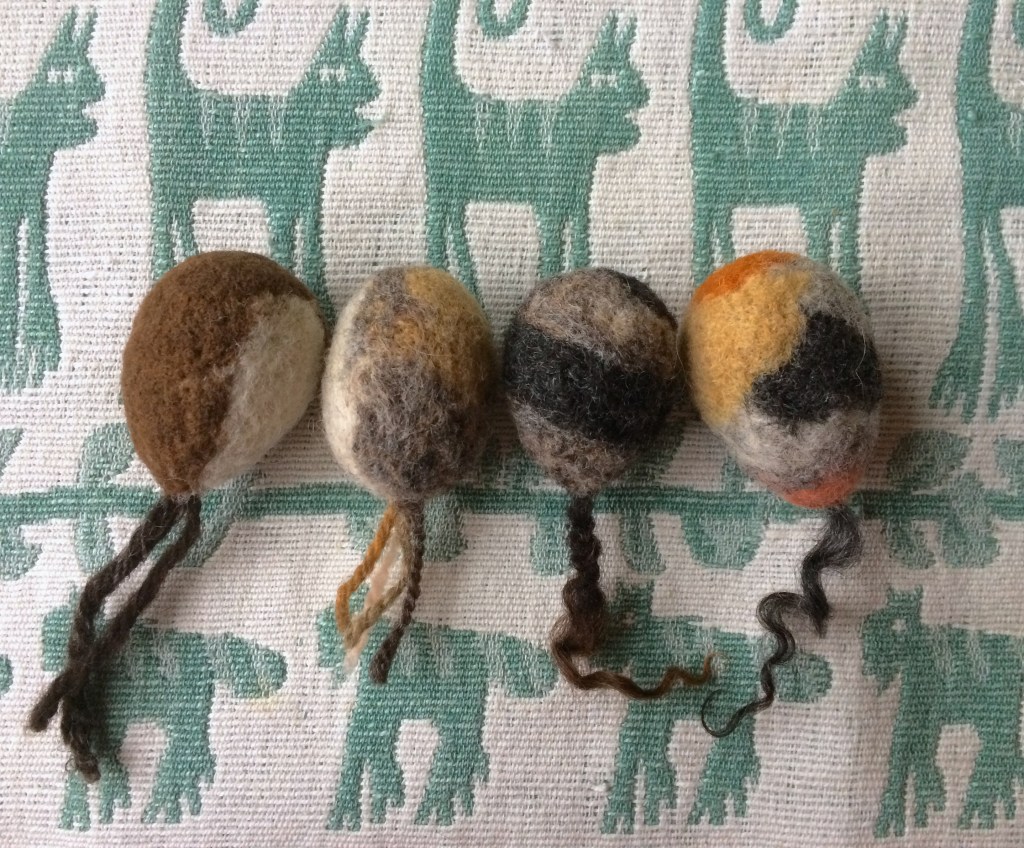 I absentmindedly felted an egg shaped “mouse” of a bit of yarn and a pile of leftover bits of wool. I threw the blob to our Heguli, 17-year old senior cat, who immediately attacked it and began kicking it around like a kitten. Then, of course, I had to make more of those blobs!