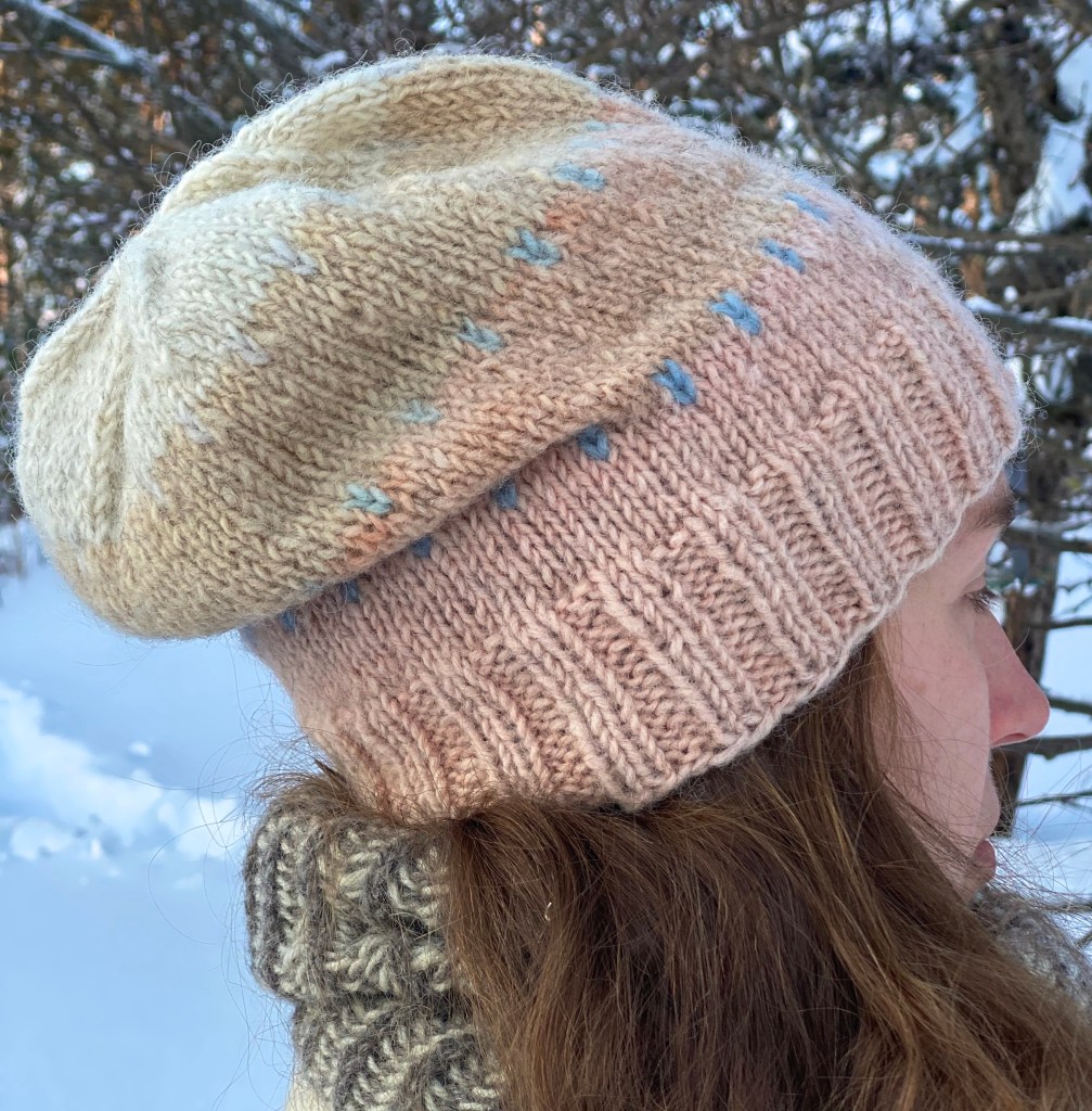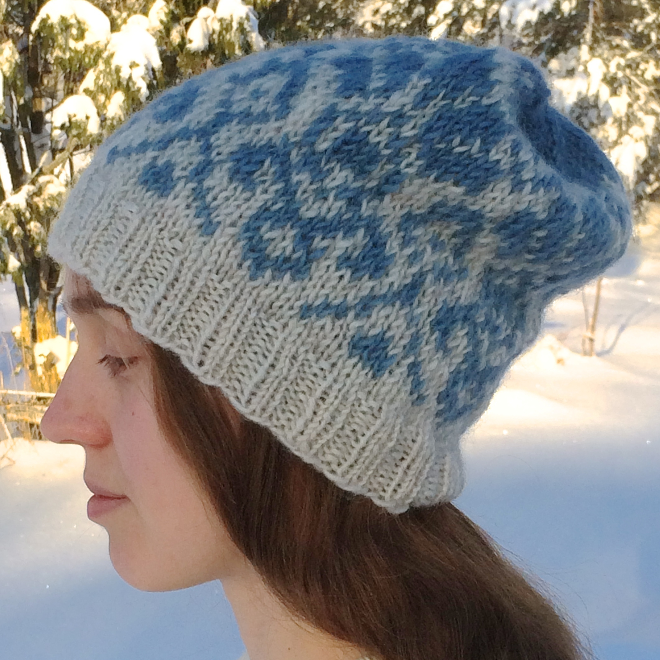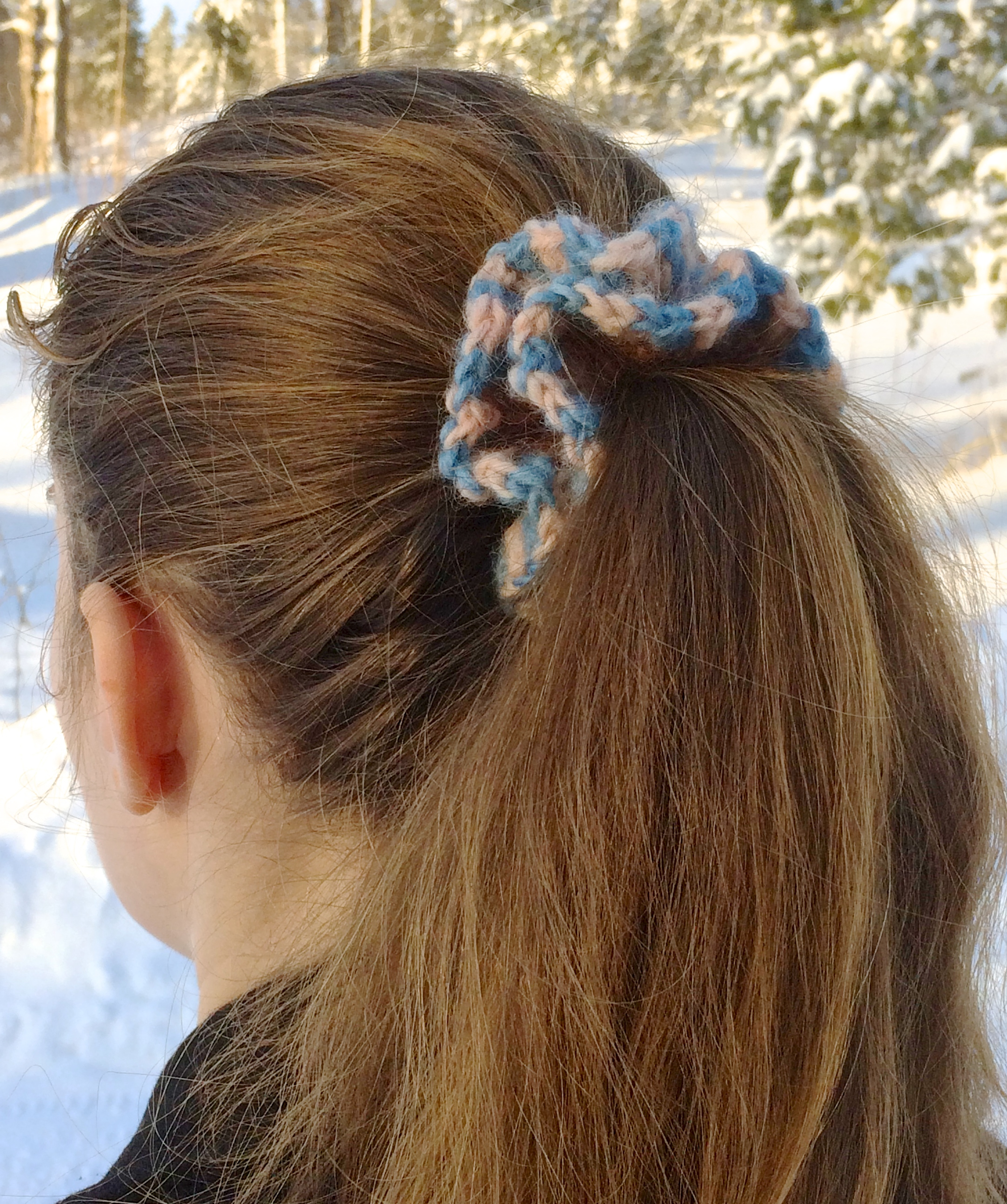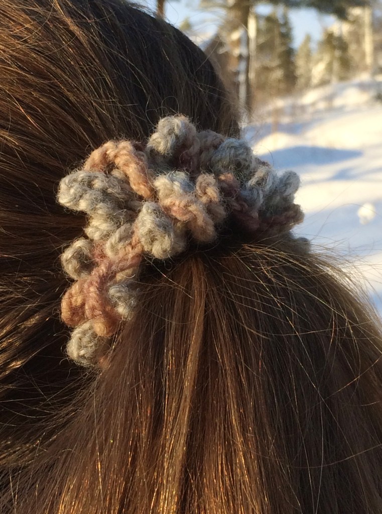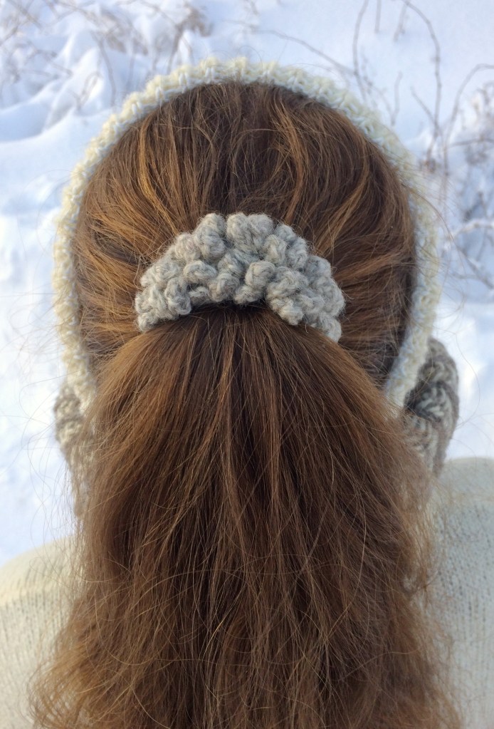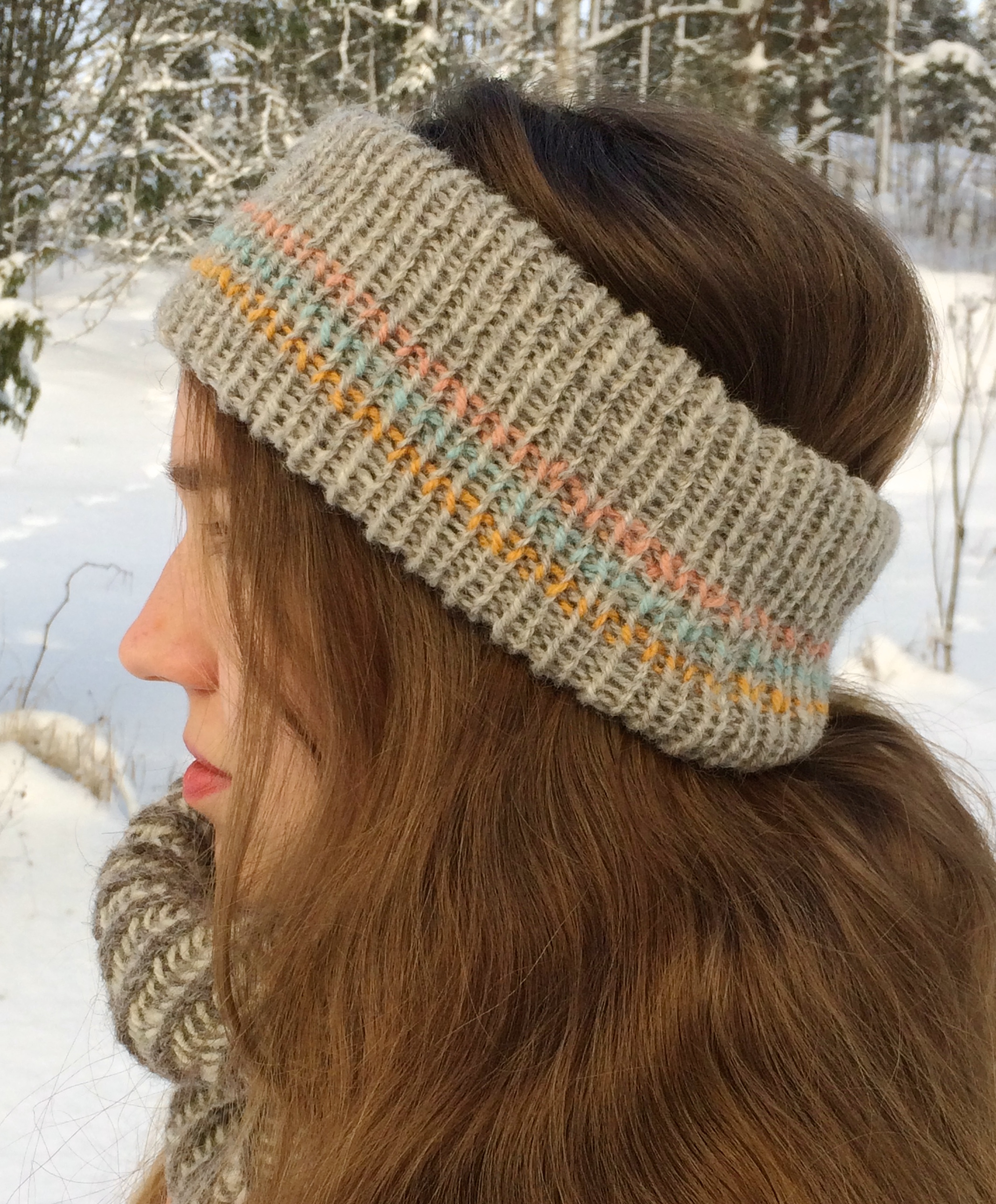After a long period of darkness a good amount of snow fell, and we got some lighter days. Then also the sun appeared, and I just had to exploit the natural light to photograph some beanies, hair loops, and my latest idea, a plush, warm, non-itchy winter head band with the visible side made of yarn spun of Leura sheep wool and the lining made of soft GOTS certified, ecological cotton yarn.